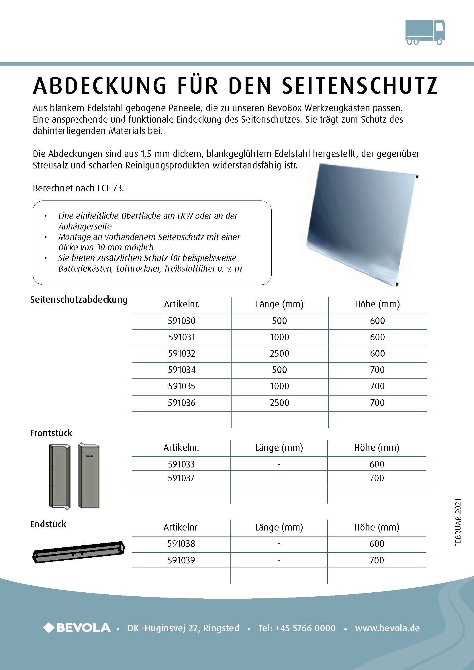 Unsere Seitenschutzeindeckung ist aus blankem Edelstahl hergestellt, der dieselbe Qualität wie unsere BevoBox™ Werkzeugkästen aufweist. Sie bilden somit eine einheitliche Oberfläche an der Fahrzeug- oder Anhängerseite.